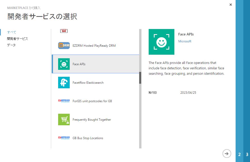 2.ログイン後↓の[Market Place]をクリックし[Face APIs]を選択し、次へ