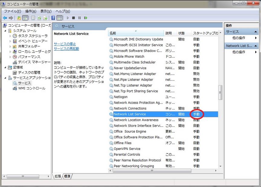 コンピュータ]を右クリック→[管理]→[サービスとアプリケーション]→[サービス]